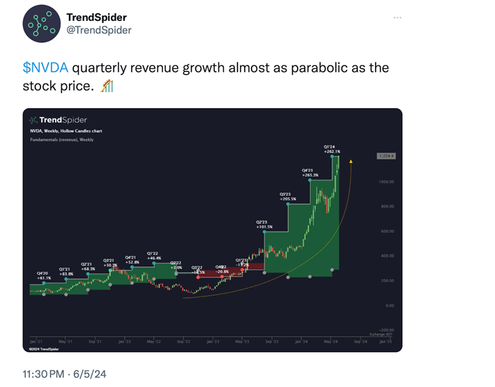 On February 25, 2024, I wrote a Market Outlook that was titled “Rocket Stock”.  Nvidia was rocketing higher, the stock price was already up 59% for the two months since January 1, 2024.  We suggested that just based on its astronomical revenue growth and the insatiable desire from big technology companies to build their future AI data centers (Google, Microsoft, Amazon, Salesforce, and many others), YOU SHOULD OWN the stock. If you would like to go back and review that article you can click here now).
