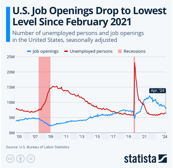 Job openings have now dropped to their lowest since 2021.  Also, recent reports indicate that non-native (includes foreigners and non-documented illegals) Americans may be the fastest to be getting labor jobs, part of this administration’s plan to let non-skilled labor enter our country to alleviate shortages in these types of workers.  See job opening chart below: