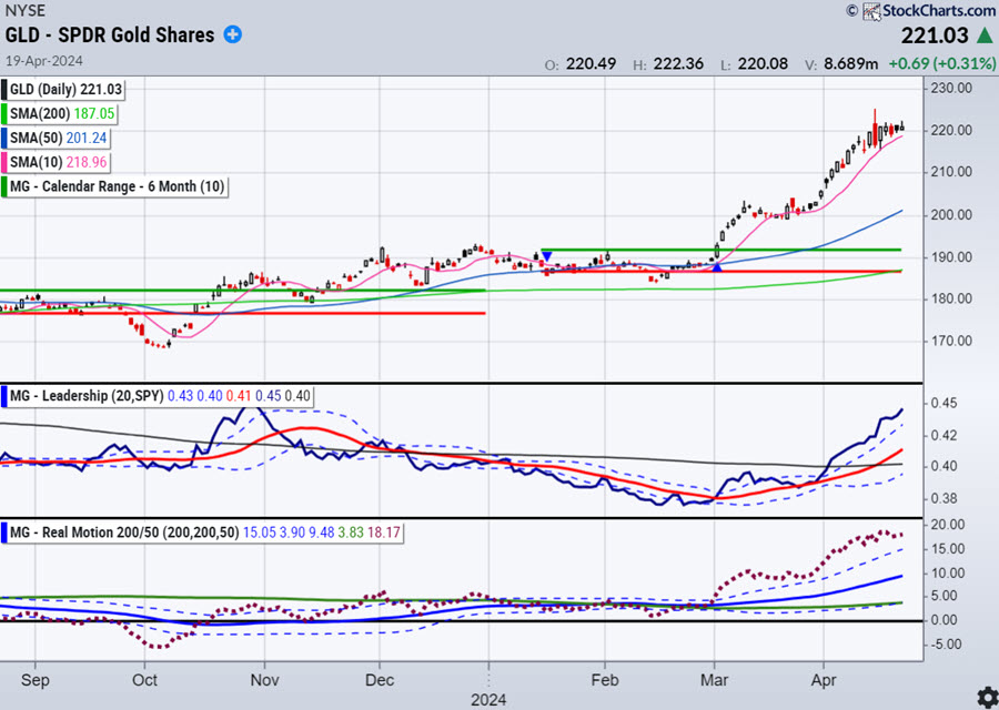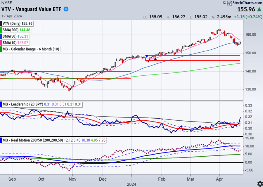 The big takeaway, at least for now, is that value stocks (VTV) are now leading growth stocks for the first time since June 2022, according to our leadership indicator, both on a daily and weekly basis.