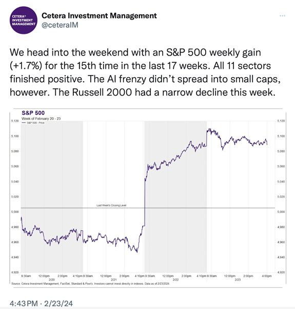 Welcome Market Outlook readers.  Happy late February.  We are getting closer to the start of Spring and warmer weather.  Hope you had a good and profitable week.  Did you hang on to your Nvidia stock if you had any?