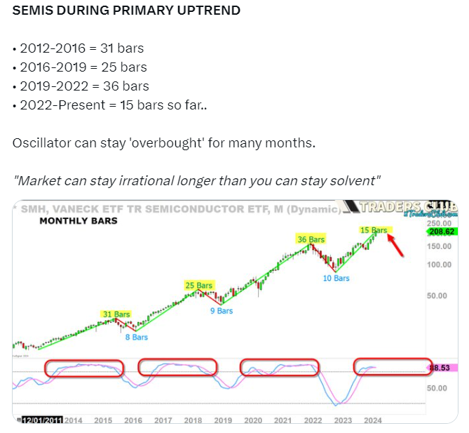 Taking a deeper dive into the stocks that are leading the market higher in 2024, you will notice that the semiconductor stocks like Nvidia and the ETF SMH are at the top of their respective list (stocks on the left and ETFs on the right).  See table below: