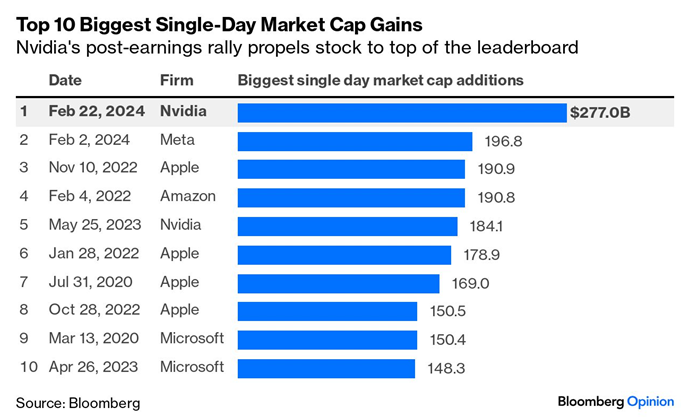 This trajectory continued Thursday, and the price of Nvidia stock ended the day up 16%, adding $277 billion in market capitalization and bringing the company close to a $2 trillion valuation.  That addition eclipsed the $197 billion gain made by Facebook at the start of the month.  It was the largest one-day historical gains in market valuations, we provide the following illustration below: