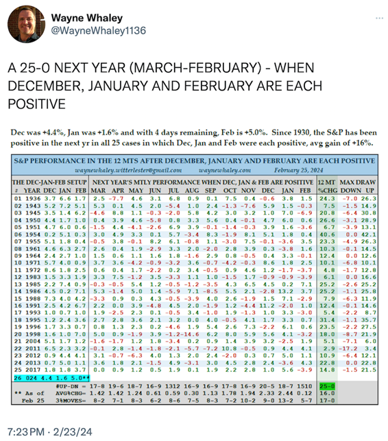 We are 4 days away from February ending positive on the S&P 500 for yet another month and the 4th in a row.  As the below chart indicates, four positive months in a row have historically led to a positive return 12 months out 100% of the time.  See chart below.