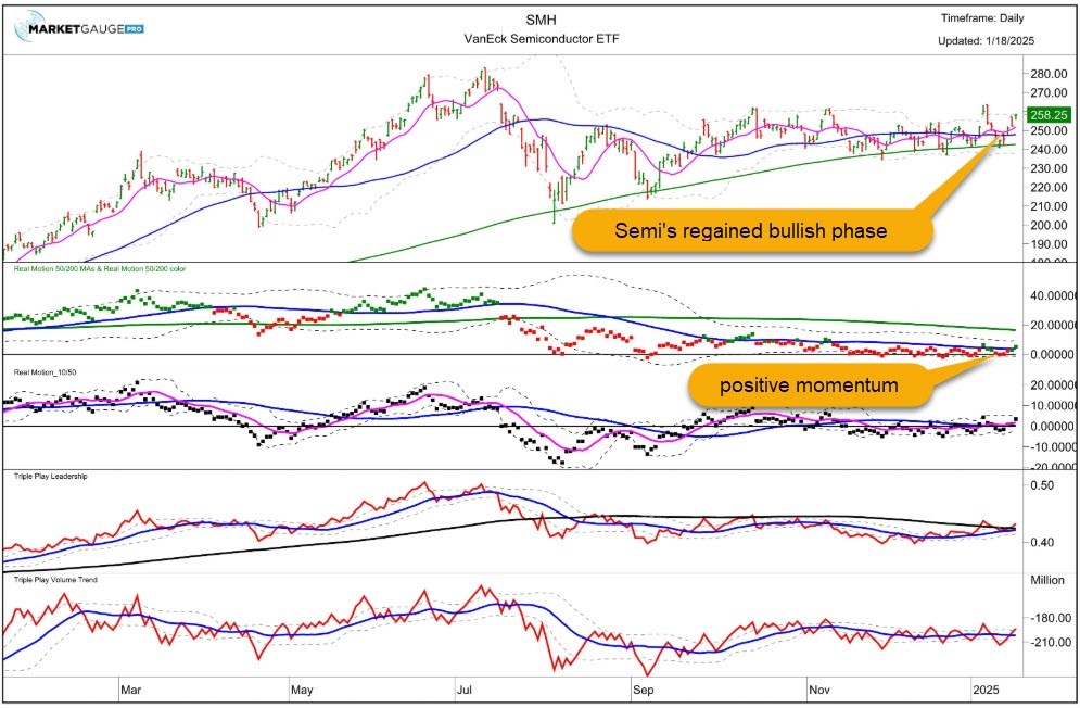 - Semiconductors tested their 200-Day Moving Average and regained a bullish phase and is outperforming the S&P benchmark. 5 of the six members of the modern family closed in warning or bear phases giving a mixed signal. (=)