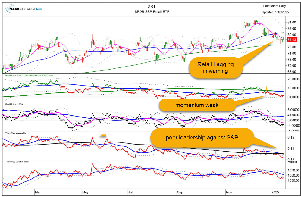 However, the retail sector was down on the week and the majority of the modern family members are in warning phases with weak momentum as indicated by our real motion indicator