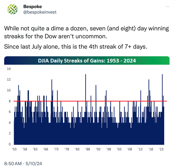 And the Dow Jones Industrial Average (DJIA) has had an impressive winning streak these past two weeks. See chart below: