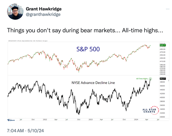 The S&P closed Friday near its all-time high, established a few weeks ago. This price behavior, along with the NYSE Advance-Decline establishing a new high, conveys a positive upward bias, which doesn’t occur in a bear market.