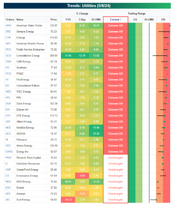 Here is a list of the Utility stocks that have been winners so far this year: (most of these stocks, as you can see from the table below, are indicated to be either extremely overbought or overbought according to the metrics used by Bespoke. (Be careful if you are invested in these or thinking about investing in any of them):