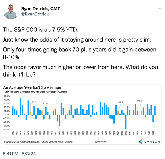 As we have been sharing with you since the last edition of Market Outlook in December, 2023, we believe this year will be filled with additional volatility and choppiness. Factor in the positive and negative factors along with geopolitical risk, especially in the Middle East, along with a divisive upcoming election and you have the recipe for the markets to grind sideways until a clear trend is established. See chart below: