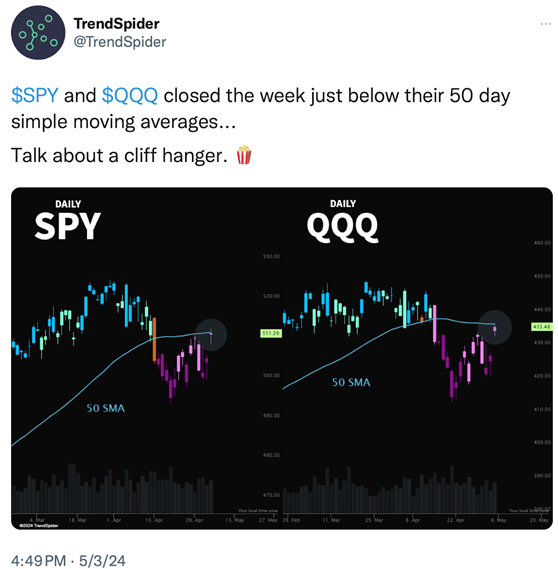 Friday morning, the April jobs report was announced. The numbers (165,000 jobs created versus the 264,000 that were expected) demonstrated a real cooling in the employment markets with the unemployment rate jumping to 3.9%. This cooling off, coupled with the recently announced softer GDP growth (1.6% annual rate), was exactly what bullish investors wanted to hear.