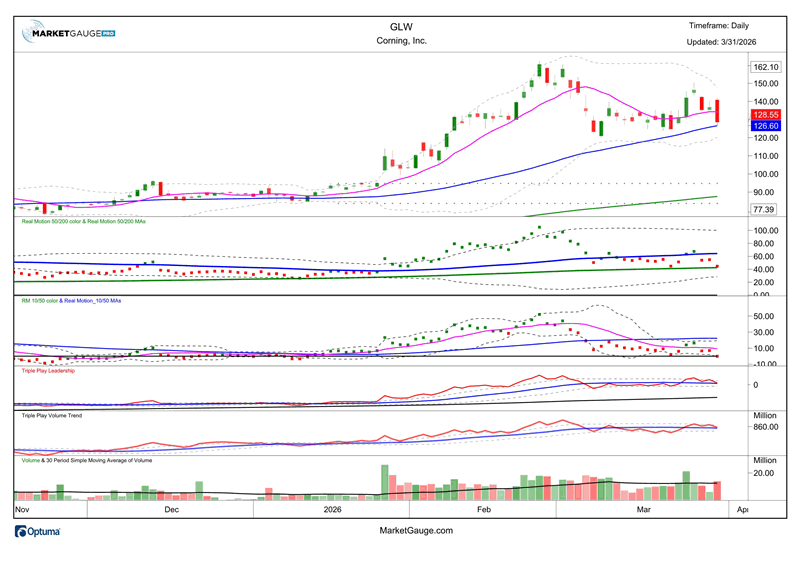 The weakness in the market over the last 2 days has pulled GLW back under the 10 DMA (magenta) and down to the 50 DMA.