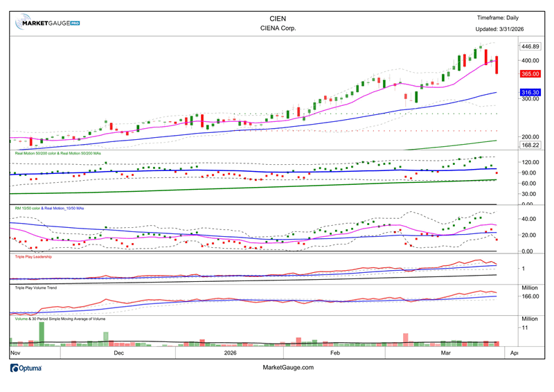Leadership and volume trend remain bullish and while the Real Motion momentum measures have turned negative, they are at levels that are likely to be support. If CIEN gets back over its 10 DMA and $400, it’s likely that everything will be lined up for a continued move higher.