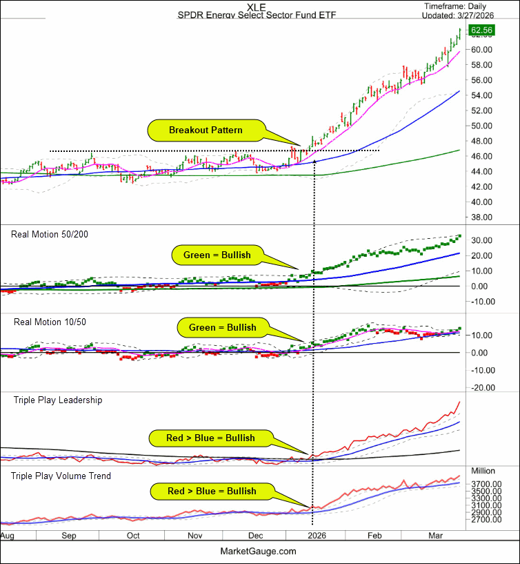 Additionally, the leadership indicator has a bullish reading, which suggests the sector’s improving price action is NOT a result of following the market. This conclusion is easy and obvious in the current bearish market environment, but when the market is trending higher, a leadership indicator with this pattern highlights the strongest trends.