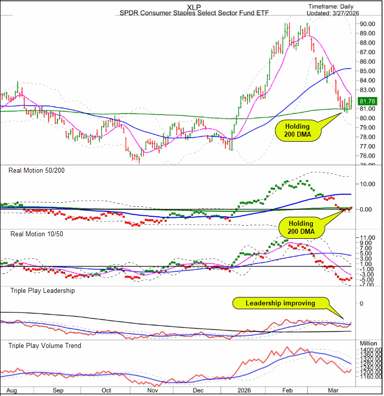 XLP, Staples, is a defensive sector, but it’s holding its 200 DMA while the market trades much lower than its 200 MA. Real Motion moving averages often identify support areas, so the Real Motion chart on the 200 MA is significant.