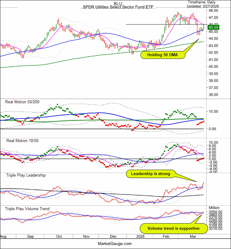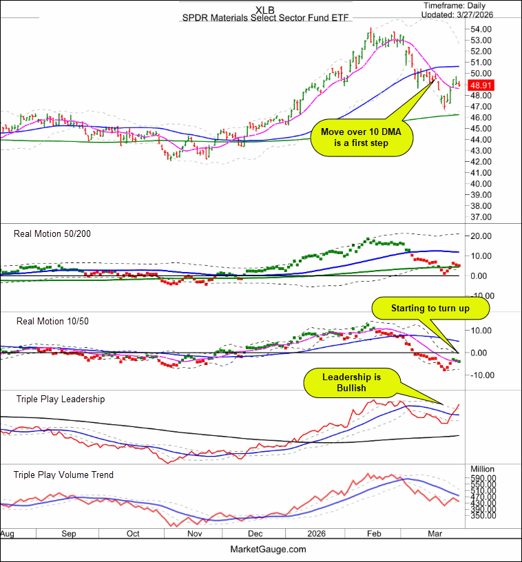 XLB, Materials, has moved over its 10 DMA and the Real Motion 10/50 momentum indicator’s green dots confirm there may be enough momentum to continue higher.