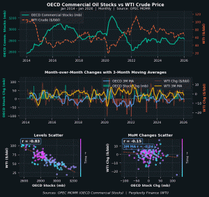 The top chart shows the level of commercial stocks (inventory excluding strategic reserves) and the price of oil. It’s clear that the price of oil is inversely correlated with the level and trend of inventories.