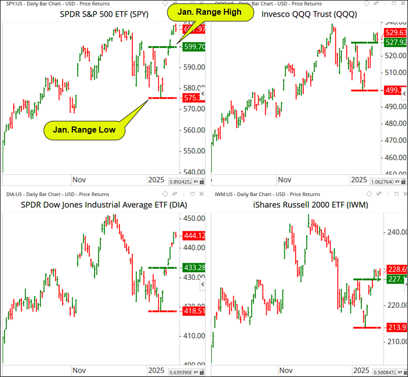 If the QQQ and IWM breakdown below their Calendar Range high, it’s a warning that the upside momentum may have hit significant resistance. Likewise, a new year-to-date high in the QQQ and IWM would be a bullish confirmation of a January trend trade breakout.