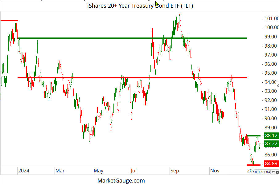 A simple way to keep tabs on the importance of the TLT in the coming weeks would be to watch its January Calendar range. The chart below illustrates its 2024 price action around that year’s range and shows the significance of a break over this year’s high.