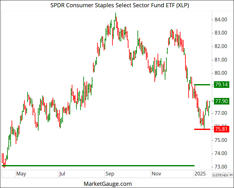 If TLT resumes its downtrend, a simple way to keep tabs on the most vulnerable areas of the market is with the calendar range. Currently, the only sector down year to date in the sectors summary table is Consumer Staples, which is a rate-sensitive sector.