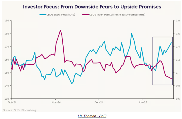 The chart below shows that the options market, as measured by the put/call ratio and skew, also turned more bullish.