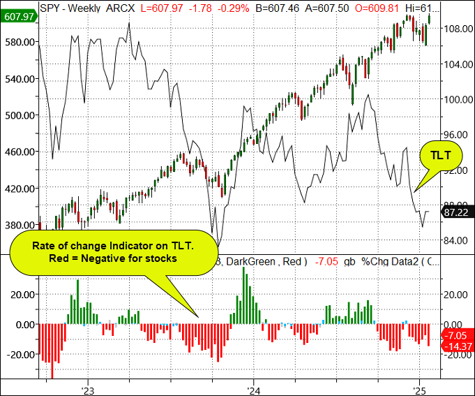 Notice in the charts below how the resumption of the TLT’s downtrend in Dec 2024 weighed even on the SPY which had rallied in the face of lower bond prices until that point.