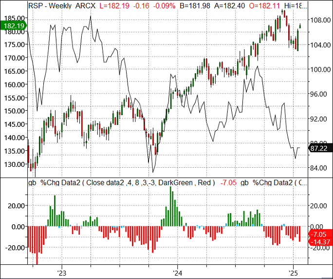 The equal-weighted S&P 500 (RSP) shown below demonstrated quite clearly in 2023 how it can be more sensitive than SPY to the rate of change in the TLT.