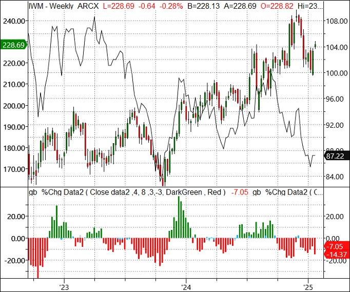 The impact of higher rates on stocks can be masked when looking at the indexes like the SPY or QQQ, which are dominated by large-cap tech stocks that can be less concerned with higher rates when they have high growth rates. However, the impact is more obvious when you look at rate-sensitive sectors or the broader market, as shown in the series of charts below.