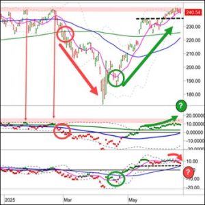 One early warning of weakness is highlighted by the red circle on the 10/50 Real Motion chart. The last Real Motion close (dot) is red which is a warning that if the price breaks its 10 or 50-day MA the weakness will continue. So a break below $250 could be more bearish than most traders expect.