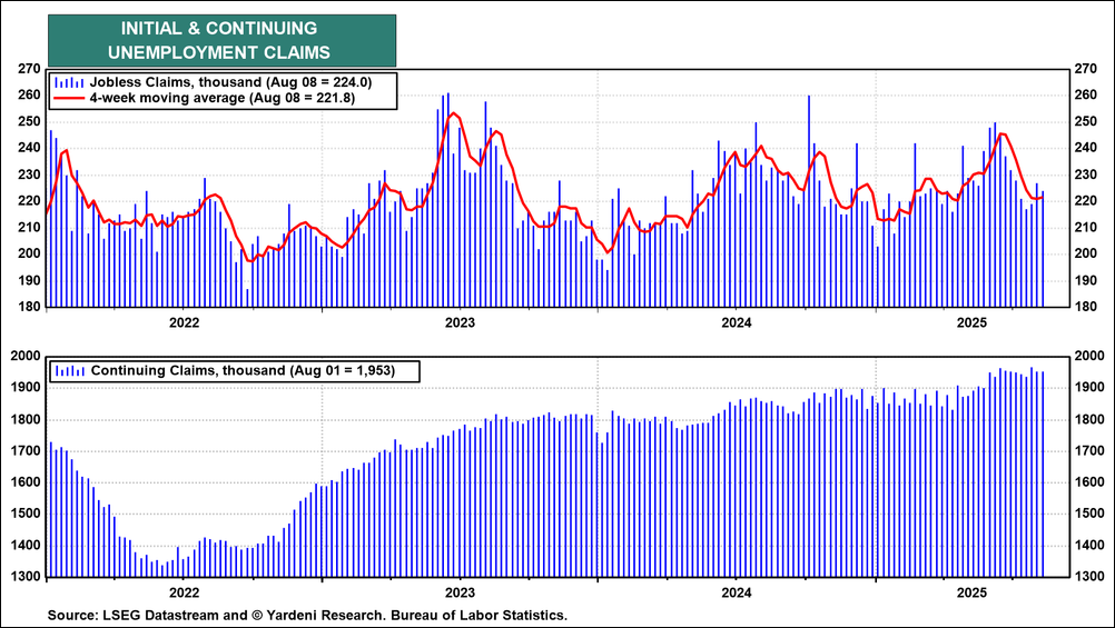 “Jobless claims remained low during the week of August 8 (chart). That suggests that layoffs remain subdued. On the other hand, continuing claims remain relatively elevated, indicating that it may be taking longer to find a job.”
