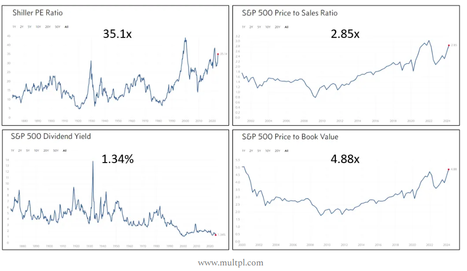 – - Other Market Indicators are at multi-year highs. Typically, when these indicators get to these lofty levels, they signal that the market’s move higher may be unsustainable. Without interest rate cuts the market may have a difficult time going higher. See S&P 500 metrics below:
