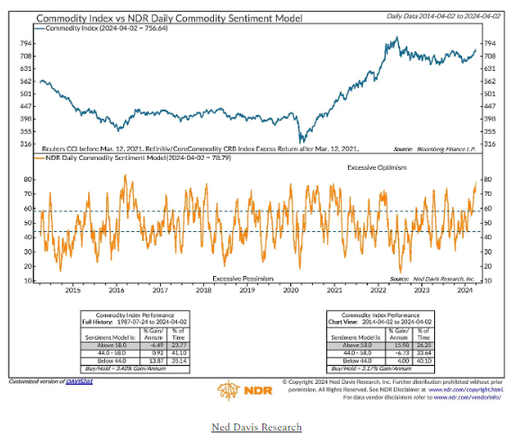 - High Commodity Sentiment. Ned Davis Research’s Daily Commodity Sentiment Model is at its highest reading (most optimistic) since March 2016. This optimism is usually an early indicator that the trend is beginning and we could see it last for a significant period. See illustration below: