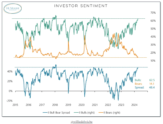 – - Investor Sentiment is at an extreme. Historically these extremes are typical when we begin to see signs that the market has peaked and may go into a consolidation or corrective period. The warning signs show sentiment readings that are very bullish, AND the bears are at a low extreme, creating the bull-bear spread to be at an extreme ratio. See chart below.