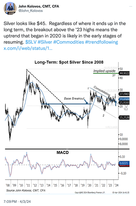 Also, last fall we showed the 10-year Treasury charts trending downward below 4.0%. We cautioned our subscribers that we might see the 10-year rate back above 4.0% given our belief that inflation could re-accelerate in 2024. Mish wrote several pieces that show what happened in the 70s and our belief that inflation will not come down so soon. Friday, the 10-year closed at a multi-month high of 4.4%. Real inflation as reported last month, is still running close to 3.0%, far from the Fed’s stated objective of 2.0%