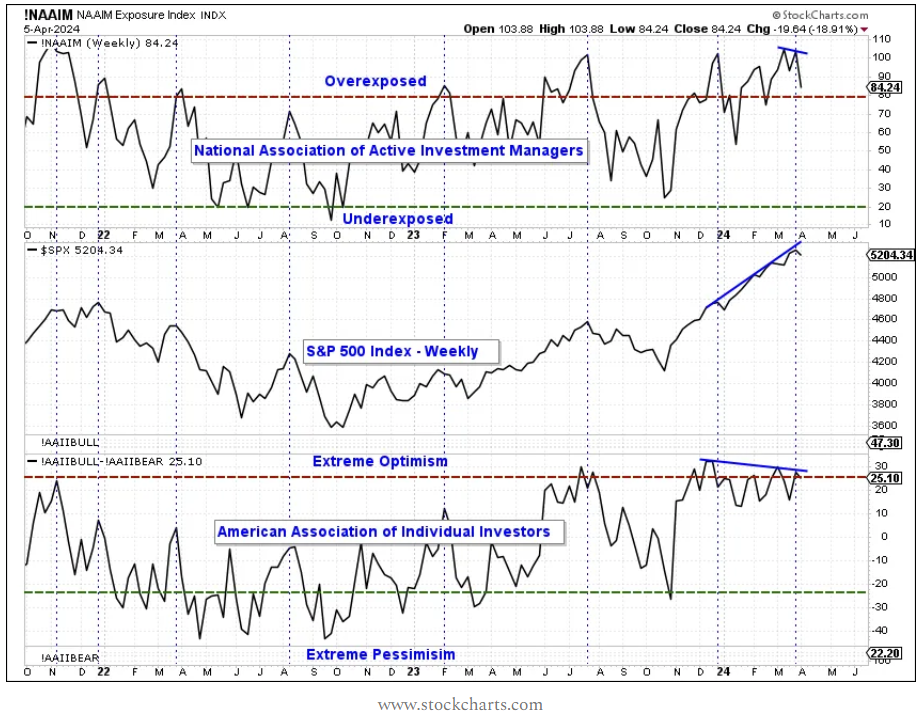 – - Other bull-bear indicators look frothy, especially those that are governed by active money managers as well as individuals. While these elevated levels are in the “extreme or overexposed” category, they have not yet hit the levels seen during the Dot-Com bubble. See charts below:
