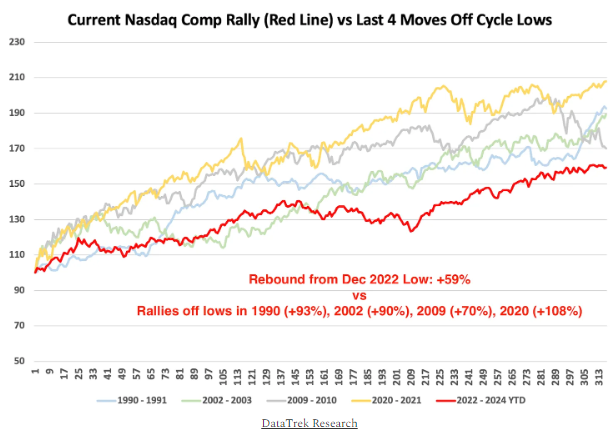 – - Nasdaq vs. cycle lows.The Nasdaq’s “performance since its December 2022 bottom is lagging every rally off its 4 prior cycle lows.”