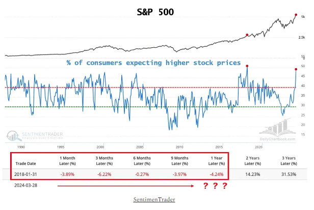 - The % of consumers expecting higher stock prices is at 49.3% per the Conference Board. That number has only ever been higher once in January 2018 at 51%. Following that instance, the SPY generated negative returns over the next 1, 3, 6, 9, and 12 months. See chart below: