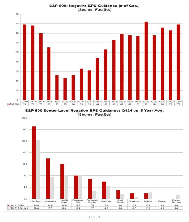 – - The first quarter’s earnings-negative guidance. Both the number (62) and percentage (71%) of S&P 500 companies issuing negative guidance for Q1 rank as the second highest ever. YES, earnings growth this past quarter had been higher than expected as companies reported good numbers. However, it doesn’t appear this is sustainable for the remainder of 2024. See earnings guidance chart below: