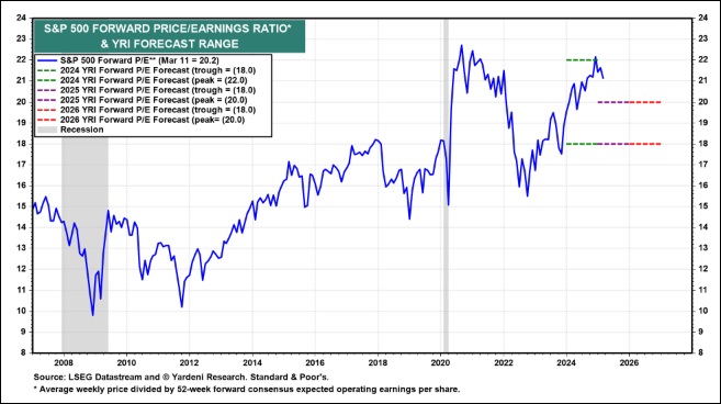 “We didn’t raise our recession odds today, but we did lower our S&P 500 targets for the end of 2025 and 2026 to 6400 and 7200 from 7000 and 8000. We aren’t cutting our earnings outlook yet, but recession fears caused by Trump Turmoil 2.0 are already causing the forward P/E and forward P/S of the S&P 500 to tumble, led by the valuation multiples of the Magnificent-7.”
