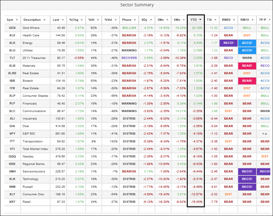 As described above, the market’s bearish sentiment and market action have been led by a fear of the consumer cutting back, leading to slower growth. This is illustrated by the XLY and XRT sector ETFs sitting at the bottom of the YTD performance column in the table below which you can also find here.