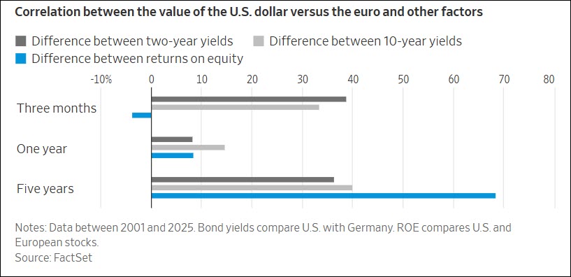 In the short run, currencies tend to be driven by interest rate differentials, but over longer periods, equity returns are an important driver of the dollar. European stocks have shown a 70% correlation to dollar-euro moves since 2001.