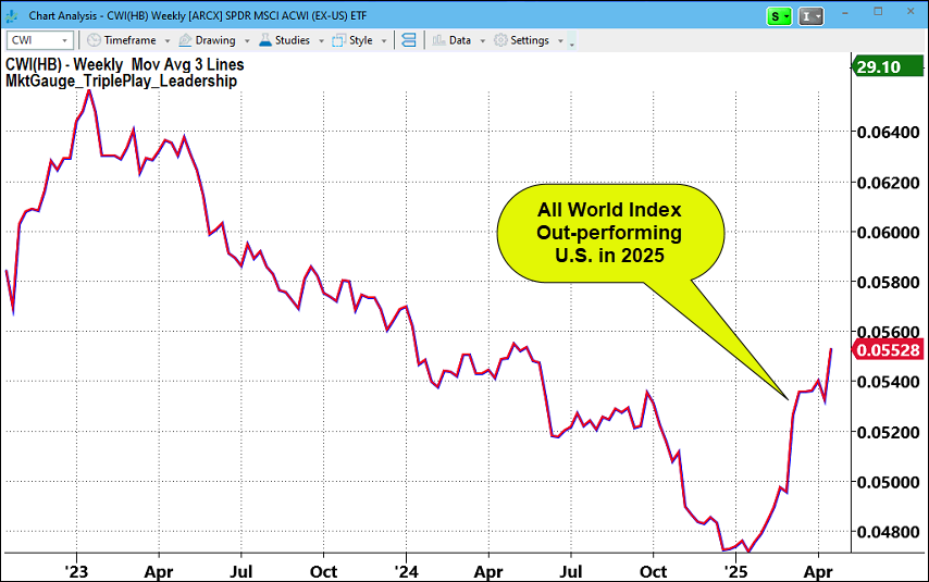 In case you’re not aware of the U.S. stock market’s underperformance relative to the rest of the developed world, the chart below shows the relative out performance (chart trending higher) of the All World Index vs. the SPY.