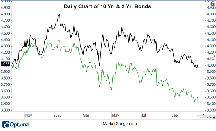 As you can see from the daily chart below, rates in the 2 and 10-year bonds are trending down, and Friday’s data didn’t move them at all.