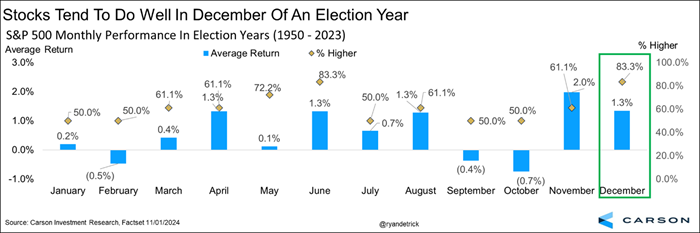 Looking at December from the positive side, you’ll see from the graph below that during the first year after an election, December has been up 83% of the time with an average gain of 1.3%