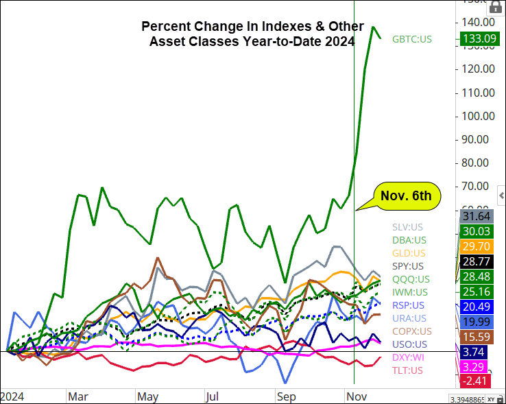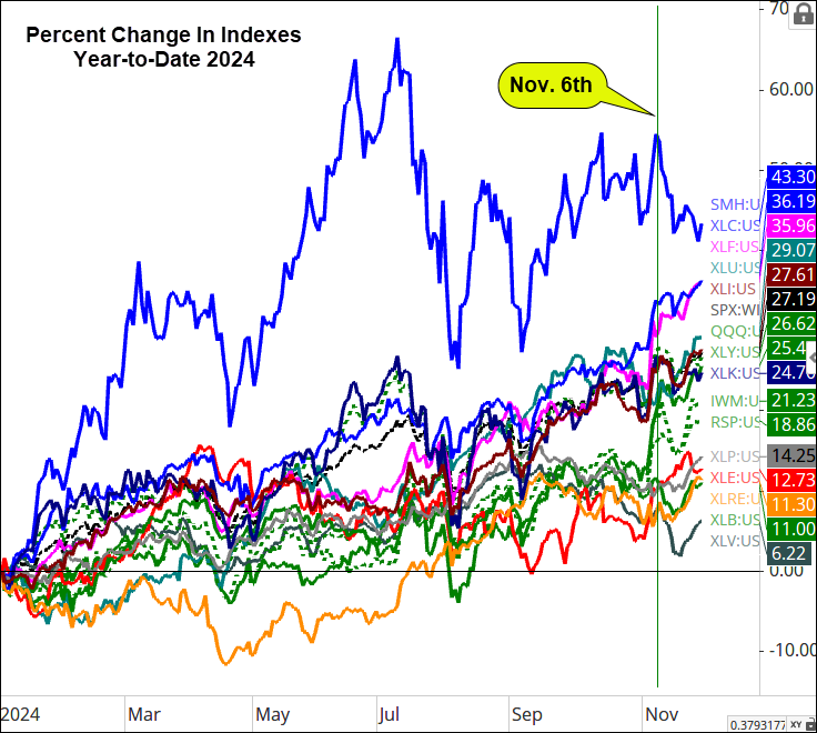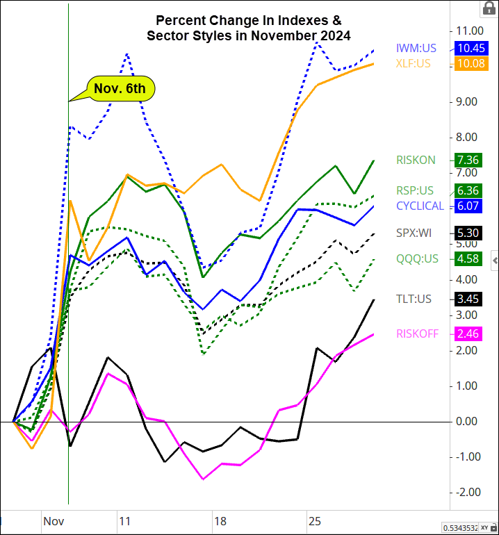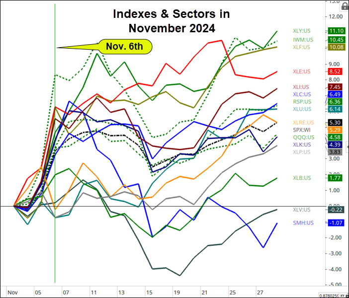 The chart below illustrates the strength through the day after the election (Nov. 6th) in the S&P 500 sectors and indexes.