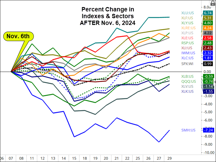 When measured from the close of Nov. 6th, shown below, the follow-through after the initial reaction to the election, the leaders and laggards looked quite different.