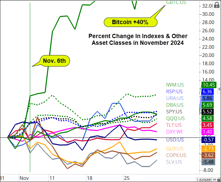 Looking at other asset classes, Bitcoin is literally off the chart. Next, equal-weighted S&P 500 (RSP) led followed by Uranium (URA), and agricultural commodities (DBA). Note, everything, even the laggards in the chart below, bottomed with the bottom in TLT.