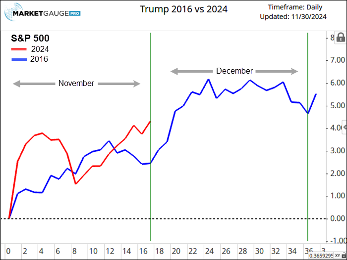 The market’s path since the election has been slightly different than Trump 1.0 in 2016, but as of right now, it’s holding the simple bullish pattern of an election range breakout.