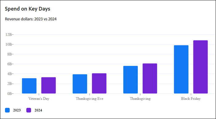As you can see by the chart below, 2024 sales have been higher this year on each day of the Thanksgiving holiday, and Cyber Monday is expected to be higher, too.
