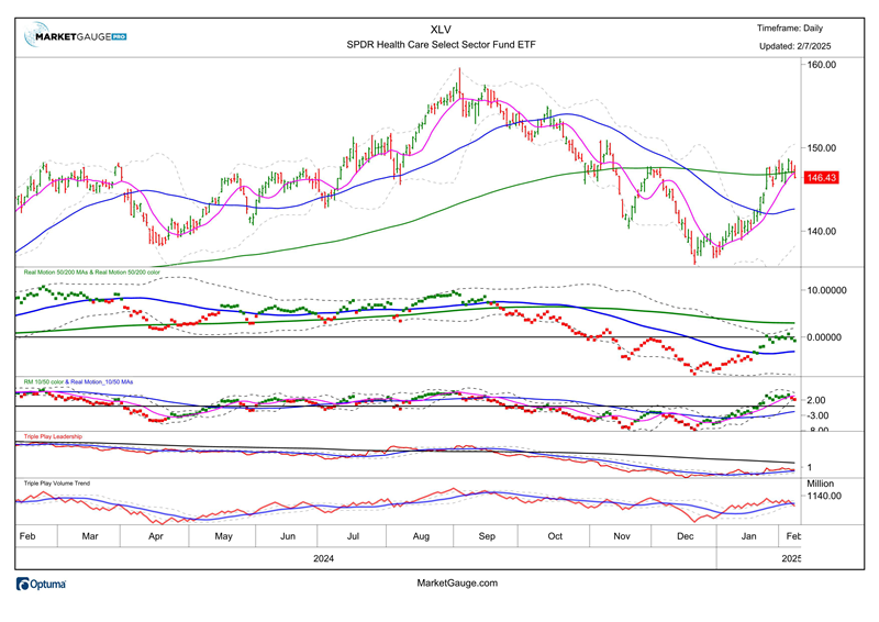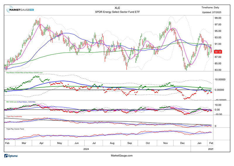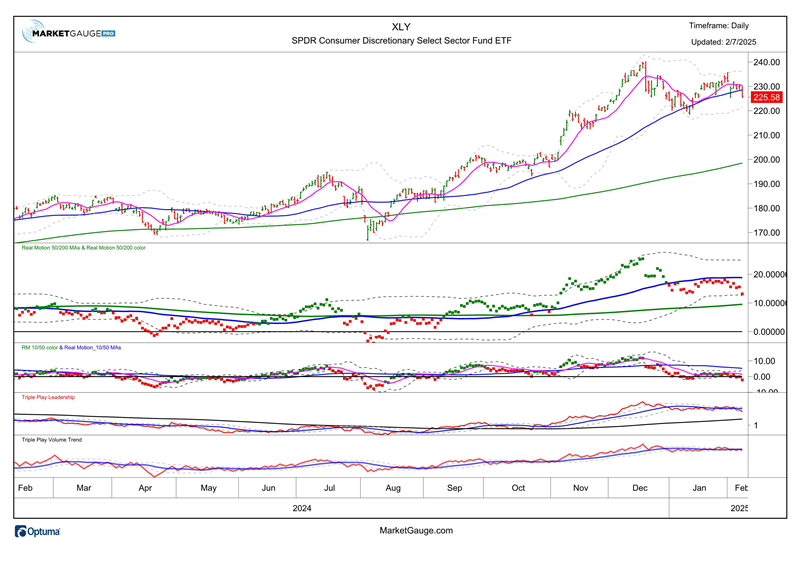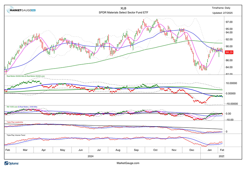 - Consumer Discretionary (XLY) and Materials (XLB) are both leading sectors and showing improvement vs. Dec. 31 in 2026. This represents a bullish trend in BOTH sectors and in these conditions relative to the 2025 chart. XLB (shown below), had a strong move in late January but has since stalled within a longer-term bearish phase. Both sectors need to make new YTD highs to confirm a durable trend for 2025.