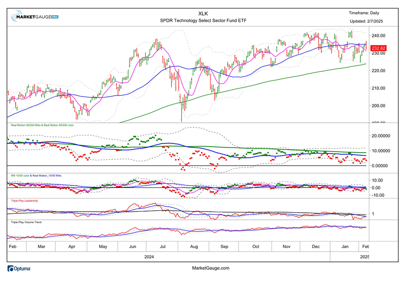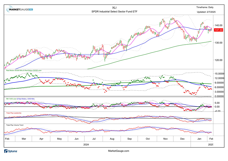 - Tech (XLK) and Industrial (XLI) remain on the left side of the index which represents the fact that they are outperforming and leading in terms of earnings growth. Both (XLI below, and XLK above) had a strong start in early January 2025, but their price action YTD has pulled back into their January Calendar Ranges.
